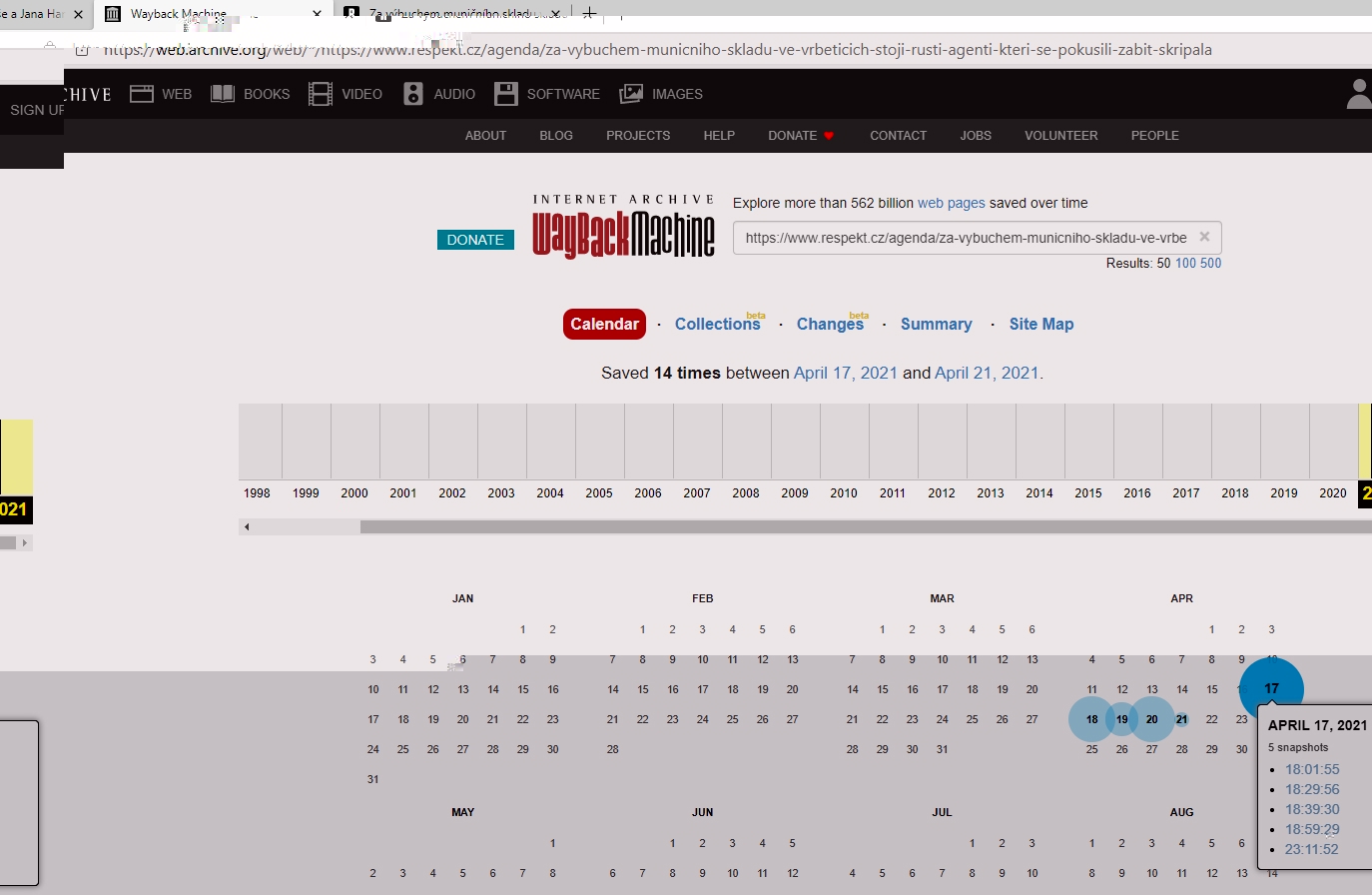 První vrbětický Kundrův článek https://www.respekt.cz/agenda/za-vybuchem-municniho-skladu-ve-vrbeticich-stoji-rusti-agenti-kteri-se-pokusili-zabit-skripala byl na webu Respektu zveřejněn v sobotu 17. dubna 2021 nejpozději v 18:01 hod. - archive.org/web má uloženou nejstarší verzi toho článku v sobotu 17. dubna 2021 v 18:01:55 hod., viz screenshot.