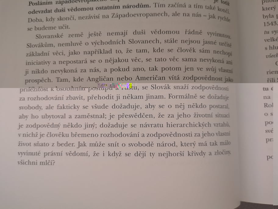 To, že Slovania sú duchovne najvyspelejší, potvrdzuje aj miestne osadenstvo. Stáva sa, že keď sa jedná napríklad o černochov, niektorí sa ozývajú, že je nimi manipulované. Ale keď sa v podobnom prípade jedná o nás, Slovanov, tí istí sa sa ozývajú, že si za to môžeme sami. Skrátka, na nás sú uplatňované iné kritériá ako na ostatných. Od najlepšieho žiaka v triede sa prirodzene očakáva viac, ako od najhoršieho. Tak to jednoducho je a nikto s tým nič nenarobí, aj keď sa bude srdiť koľko chce.