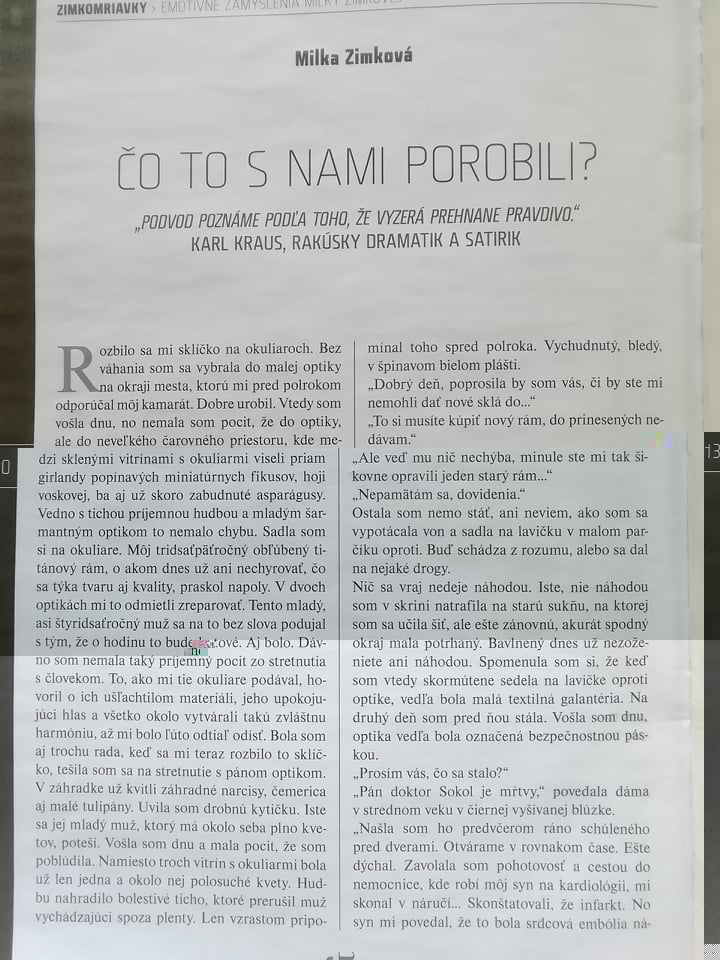 Príbeh od Milky Zimkovej // https://sk.wikipedia.org/wiki/Milka_Zimkov%C3%A1 //, Zem a vek, apríl 2022.