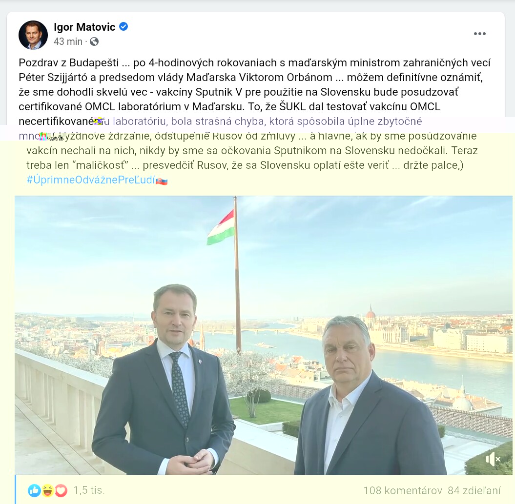 "Vzhľadom na to, že takéto hrubé klamstvo, znevažujúce túto vakcínu, bolo zo strany šéfky ŠÚKL pustené do sveta, ktoré v podstate hovorí o tom, že Rusi si balia čokoľvek do tých ampuliek a vždy tam dajú iba nálepku Sputnik V, musíme potvrdiť tieto výsledky v maďarskom OMCL laboratóriu," doplnil.